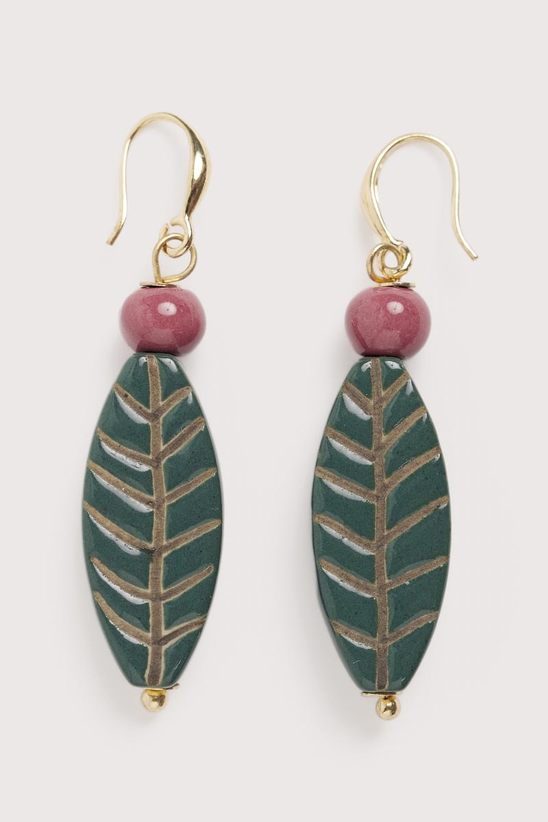 Complement a leafy print or add a pop of colour to your outfit with these lovely leaf-form earrings. They’re crafted from glazed ceramic for a rich finish, topped off by a bright little bead. The gold-coloured loop and post bring a subtle gleam. Pair with our Charmer necklace.