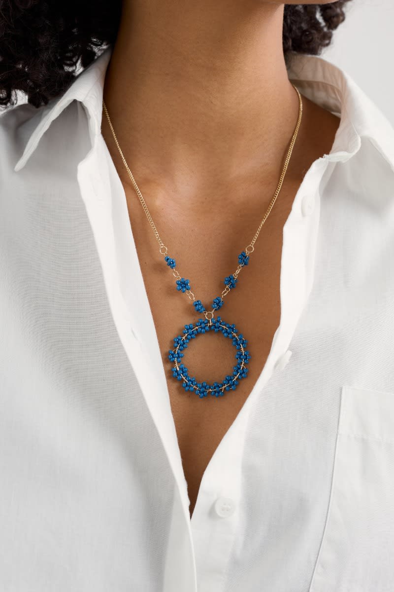 Clusters of delicate flowers form an elegant circular pendant on this statement necklace. They’re crafted from light-catching little glass beads, which contrast with the warmer glow from the gold-toned chain. You can subtly adjust the length of the necklace to suit your neckline.