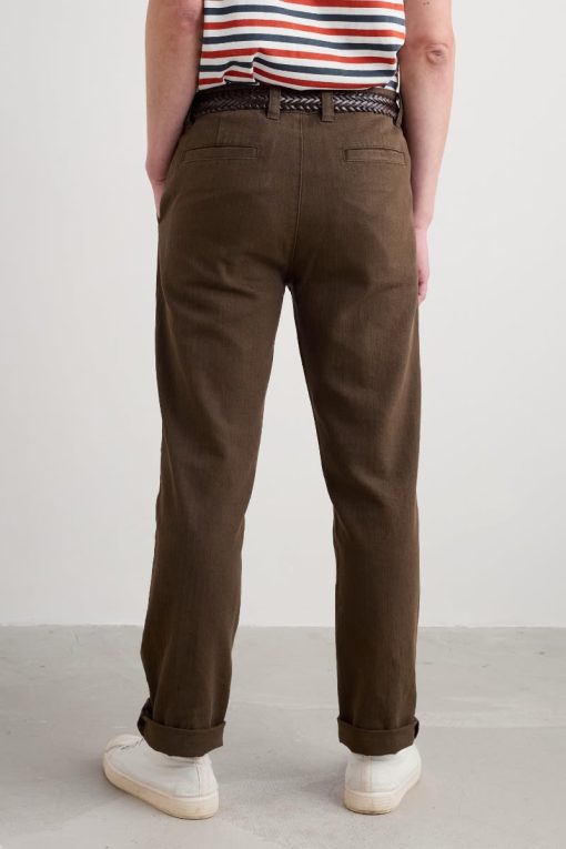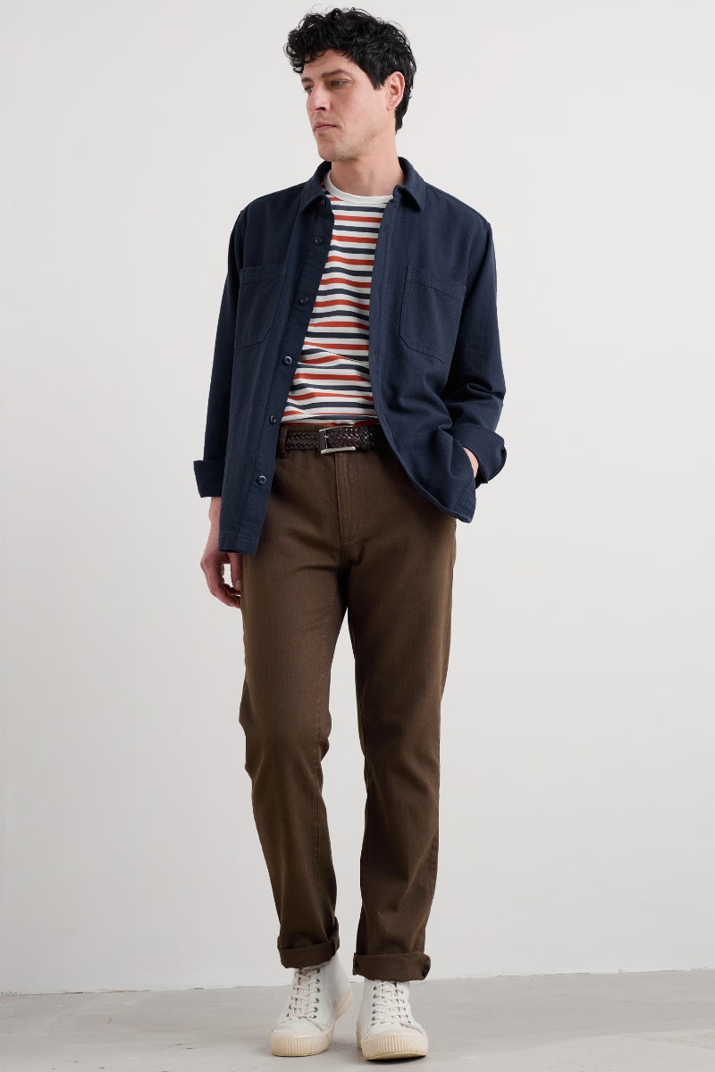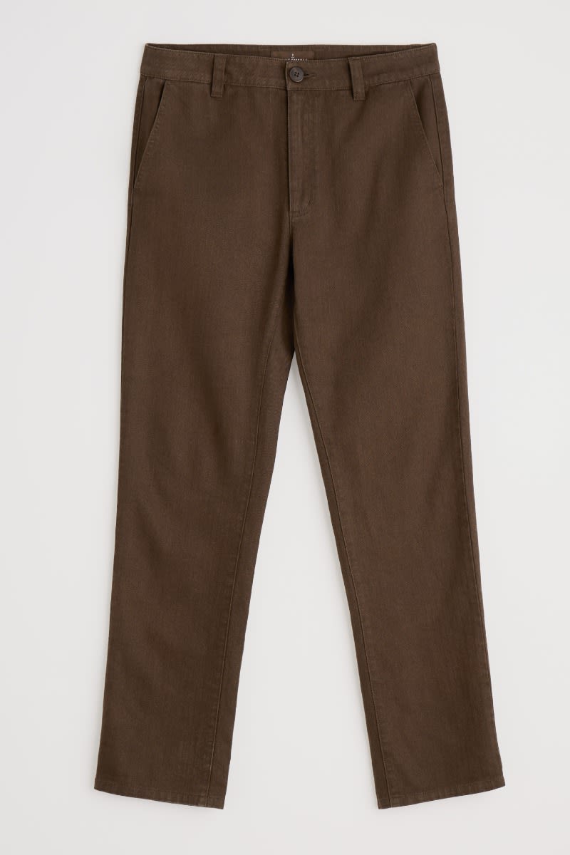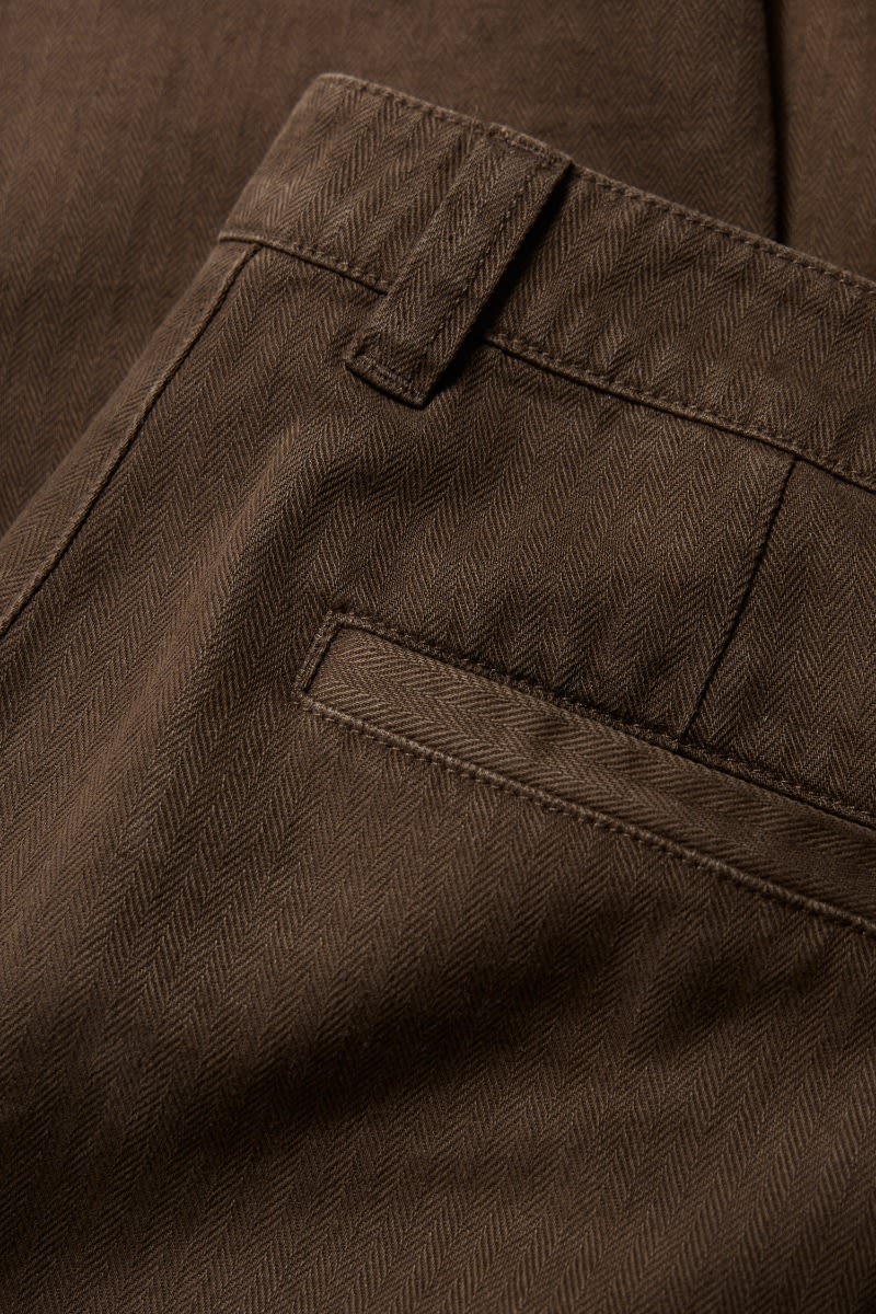A neat, slim fit trouser in a cotton linen blend with a light herringbone texture. The Tollgates have been cut for a sharp, streamlined silhouette with a full-length leg that can be rolled to your length of choice. Designed to pair with our Tollgate Jacket, the trousers feature classic detailing like the rear jet pockets and dart shaping.
