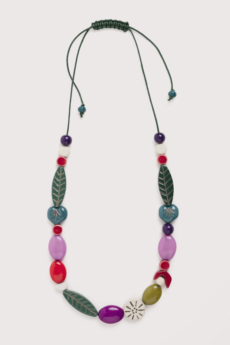 A colourful necklace featuring resin and ceramic beads on an adjustable cord. Inspired by natural shapes, the composition of leaves add depth and interest to any outfit.