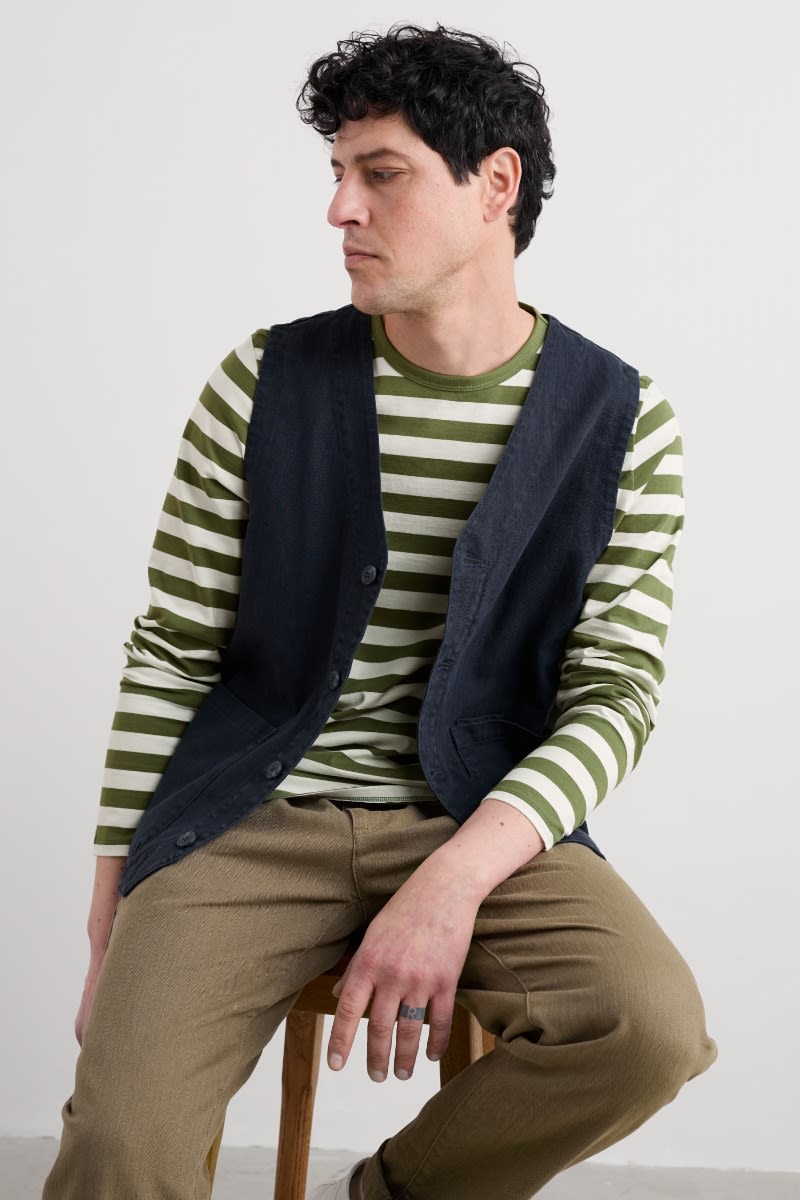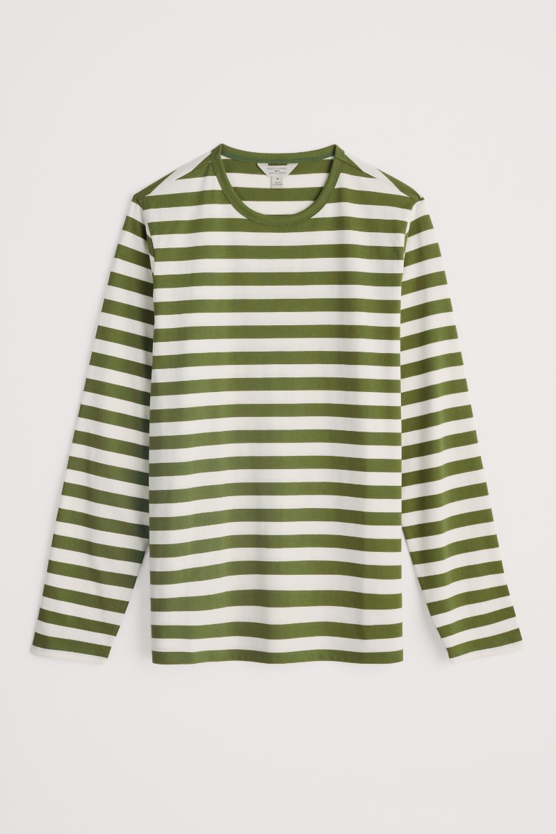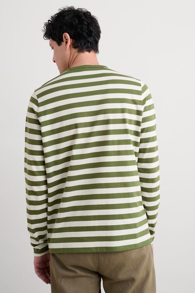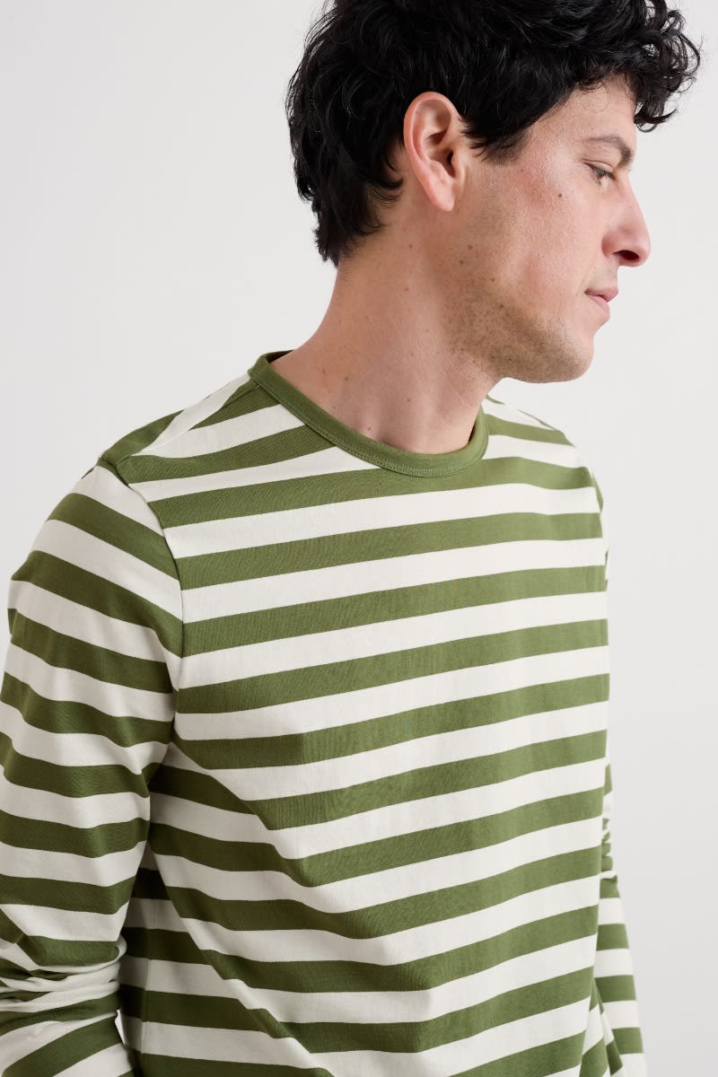 A crew neck long sleeve T-shirt, with yarn-dyed stripes inspired by Breton tops and colours drawn from Cornwall’s maritime heritage for an authentic nautical feel. Made with breathable organic cotton jersey, it’s a year-round essential you’ll reach for again and again.