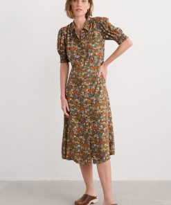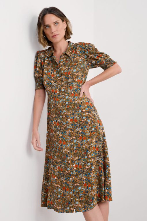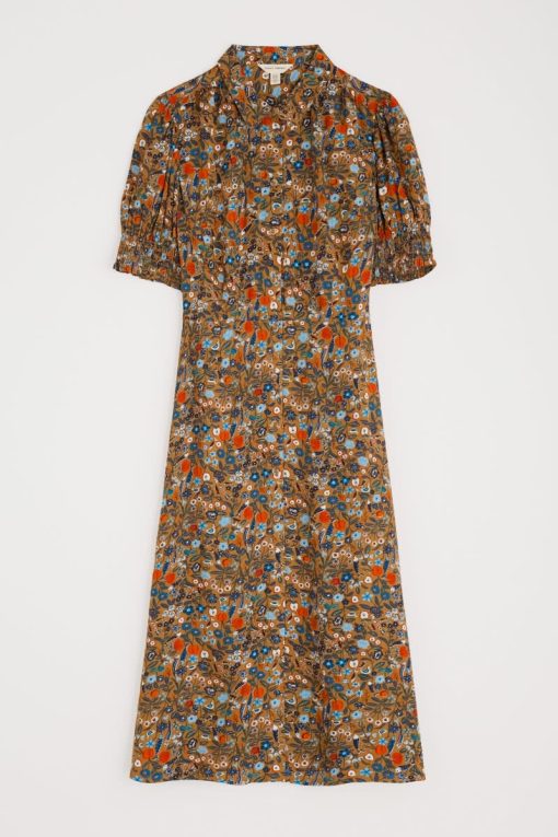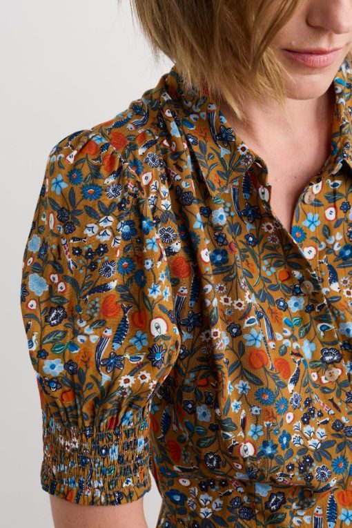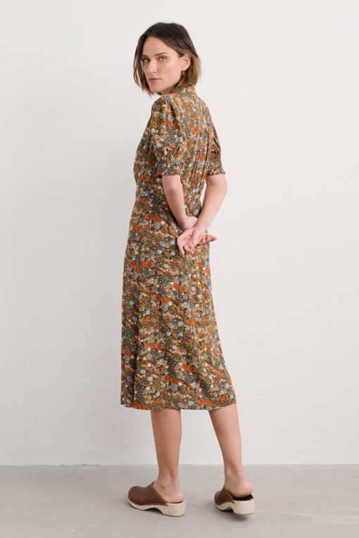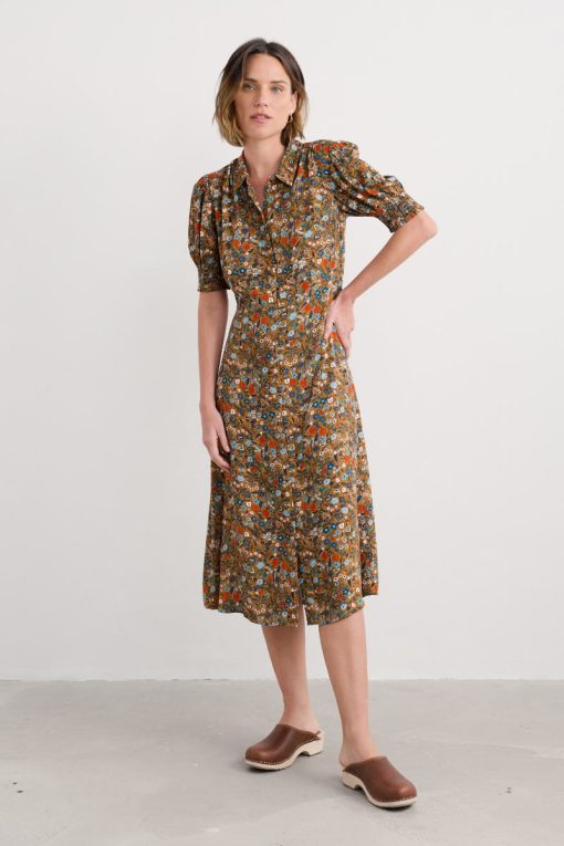 A sweet, simple tea dress with elevated details. The midi-length Bridget features a small collar and button through detailing, allowing you to create your own v-neckline shape. The half-length sleeves have been sewn in with gathers at the shoulder and smocking at the cuff for a subtle puffed shape.