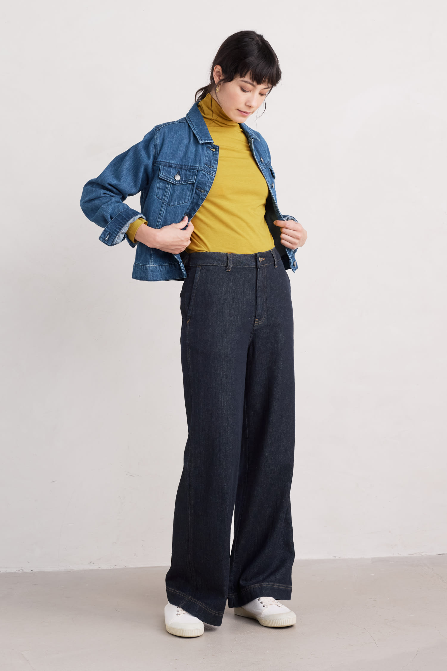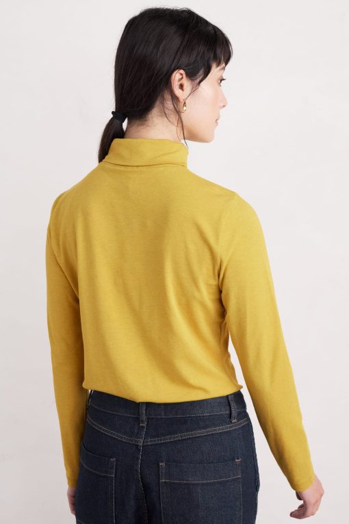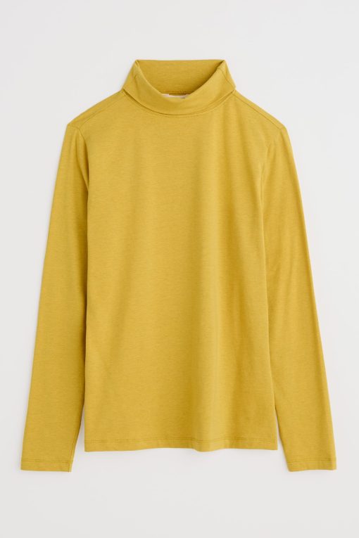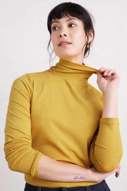 A semi-fitted long-sleeved top with a slouchy roll neck made from organic cotton with a hint of stretch. Our Landing Top comes in a choice of subtly textured Cornish colours and looks lovely worn with denim or layered under our dungarees and pinafore dresses when it’s cooler.