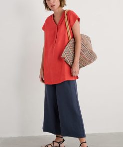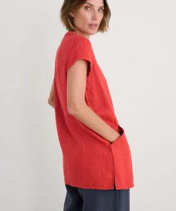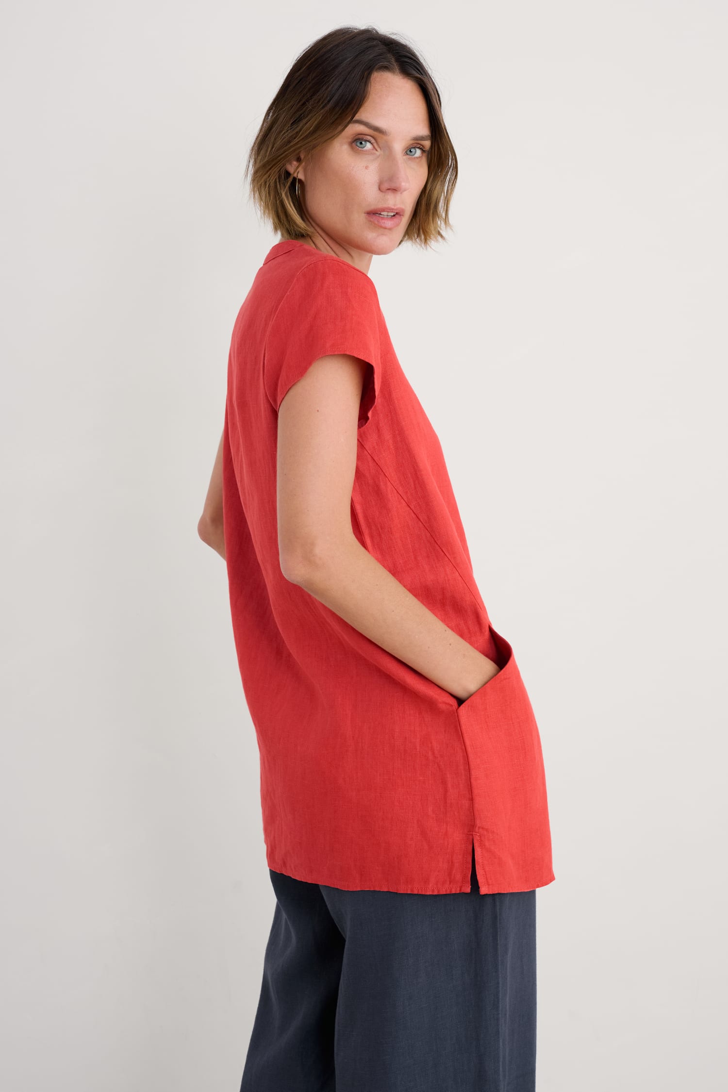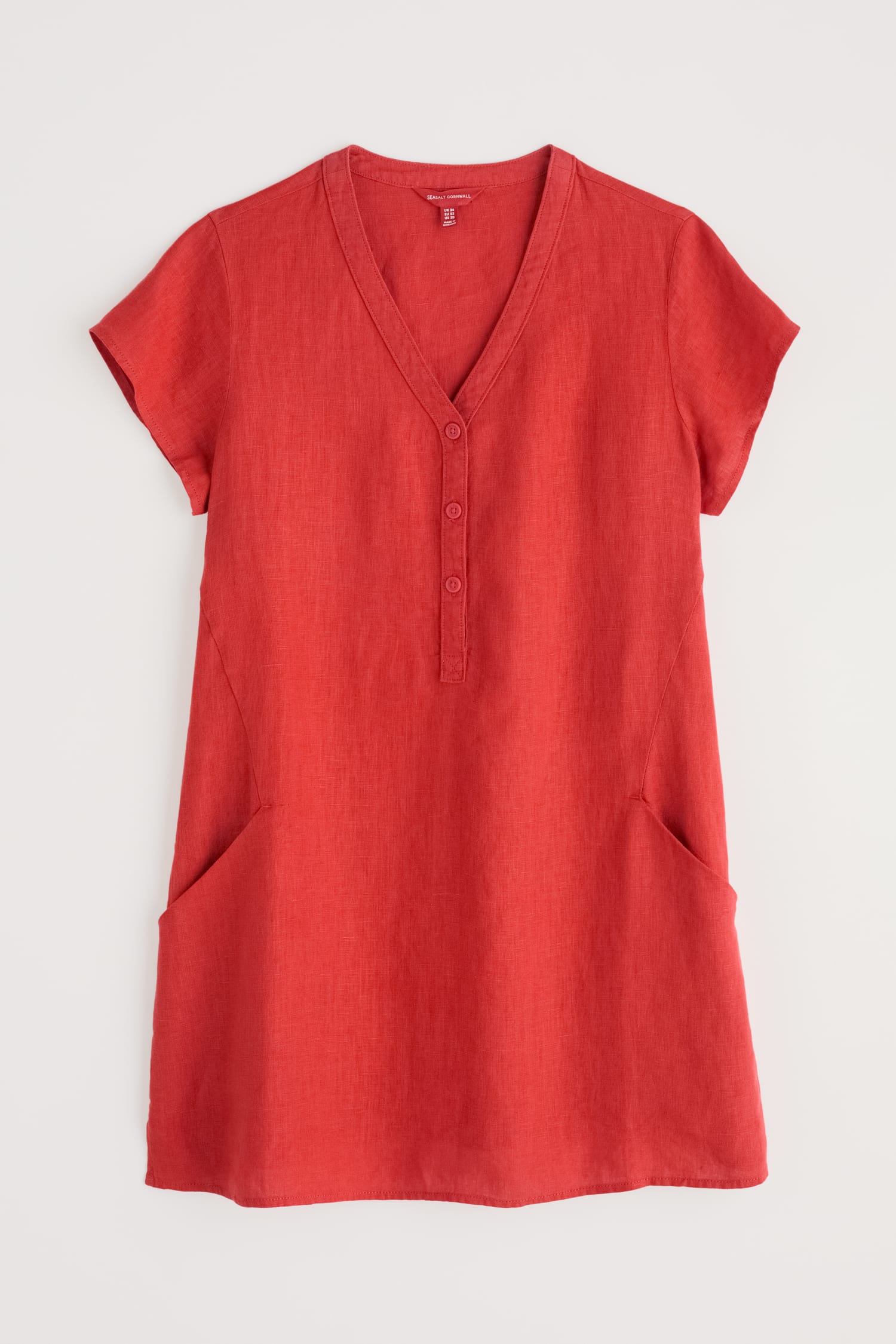A short-sleeved linen tunic in a textured garment dye with natural highs and lows. It has a slightly flared A-line shape and button detail v-neck. Finished with cap sleeves and side pockets, the Little Croft Tunic is an easy-to-wear wardrobe staple.