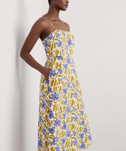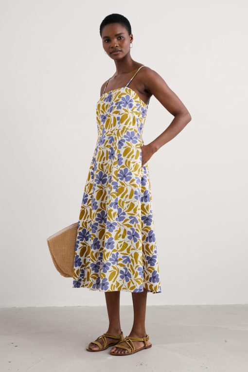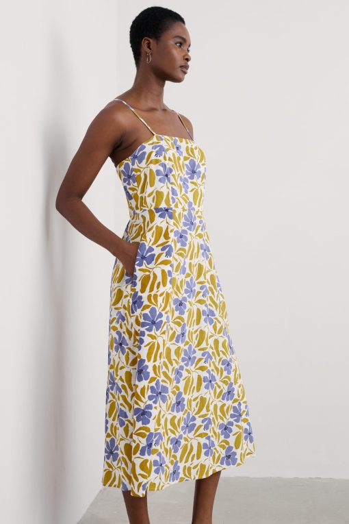 Simple summer joy in a dress. Made from organic cotton in a classic fit-and-flare shape with a shirred back panel, adjustable shoestring straps and an all-over print. Dress up or down and celebrate the sunshine.