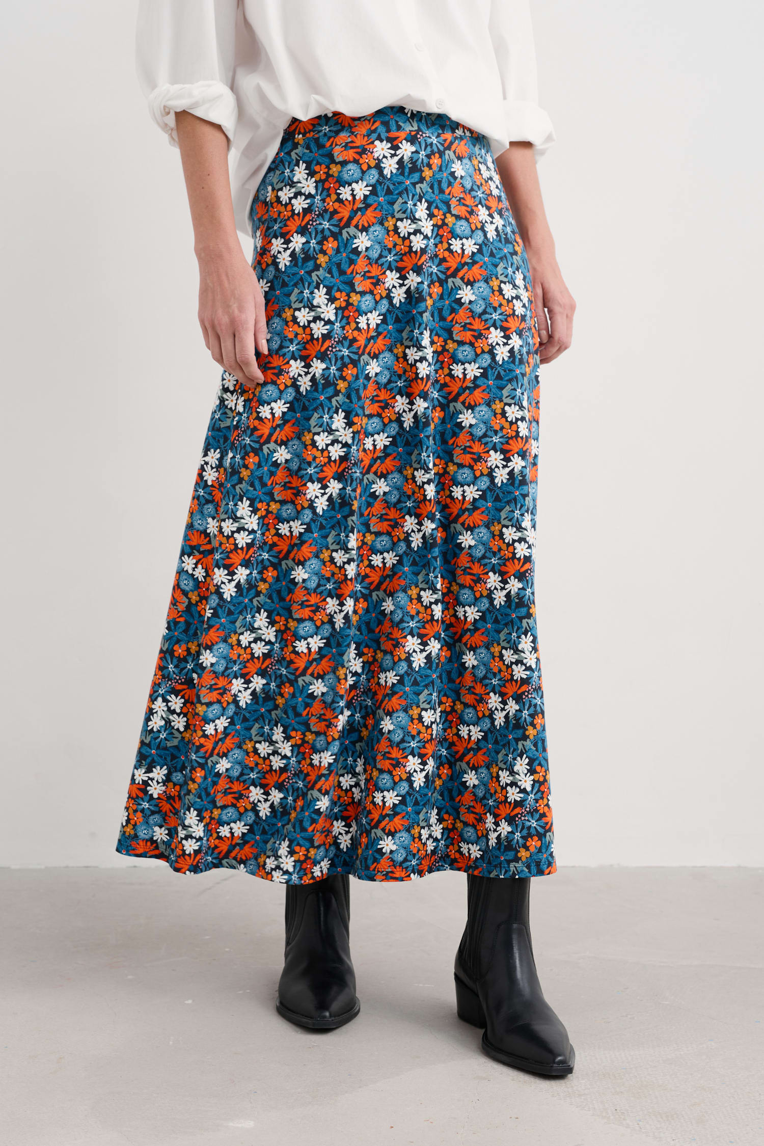 The ankle-length version of our popular Rose Skirt. Designed for ease, the A-line skirt has a gentle, easy movement. Choose from a selection of seasonal prints and colours designed in our coastal Cornish studios.