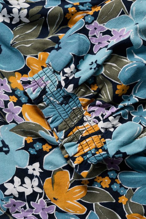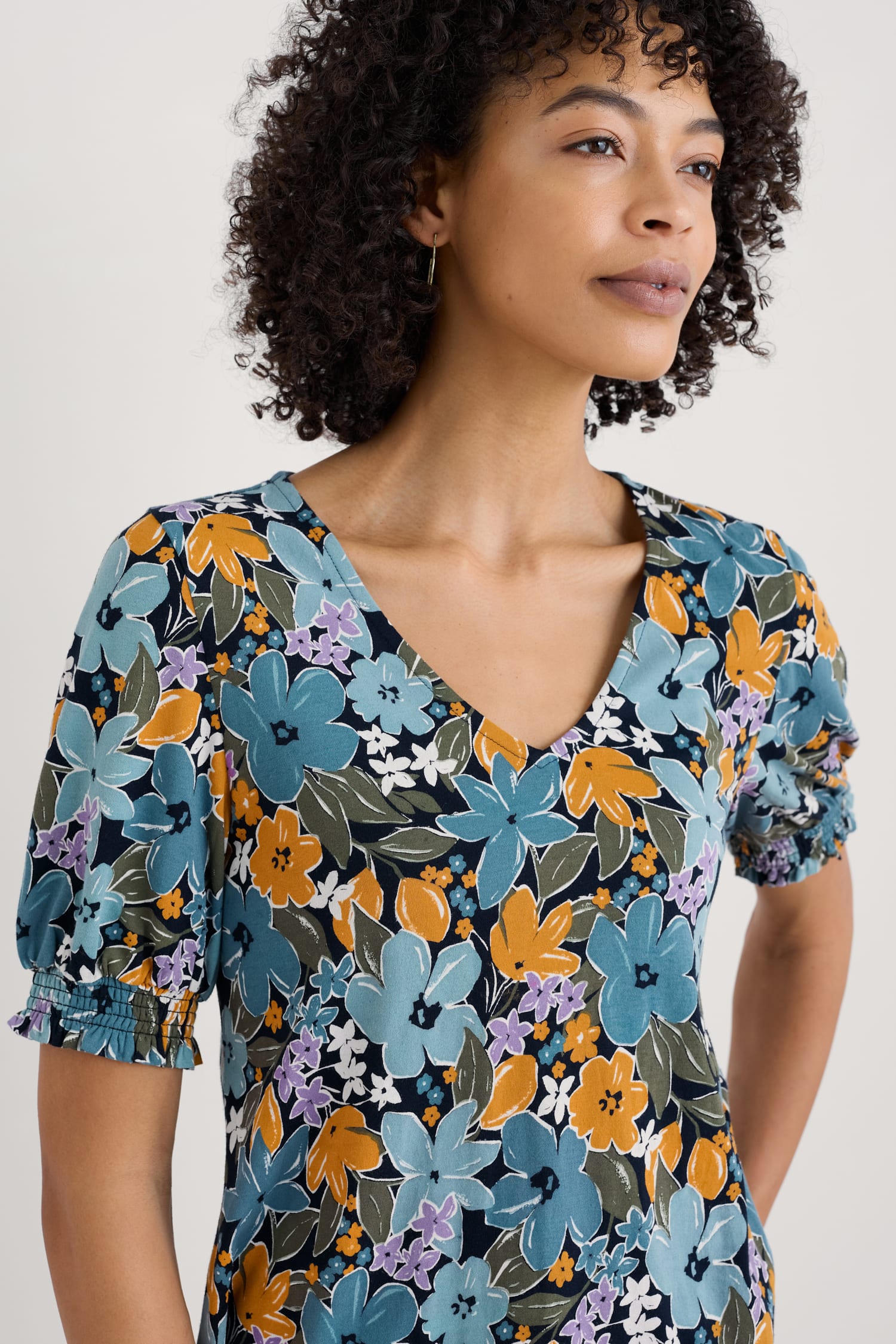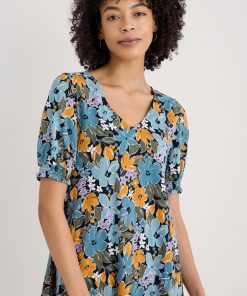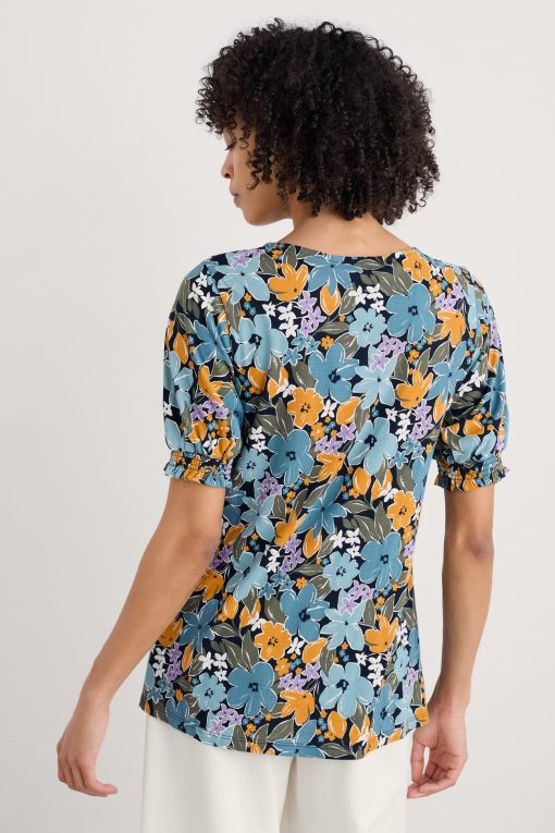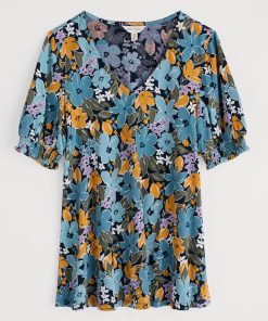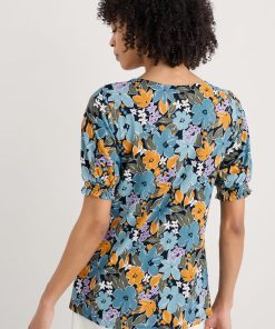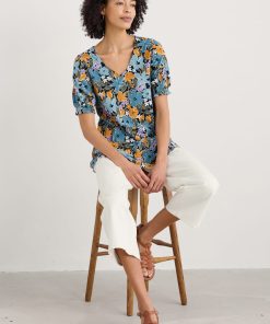 Seasalt Cornwall Women’s Rosehip V-neck Jersey Top – Smart Blouson Printed T-shirt | Citrus Floral Poseidon