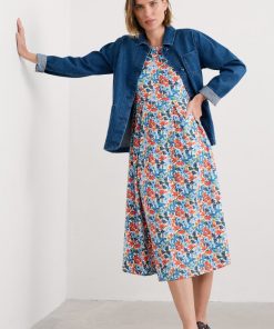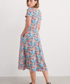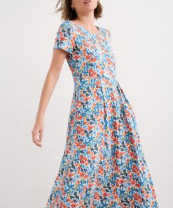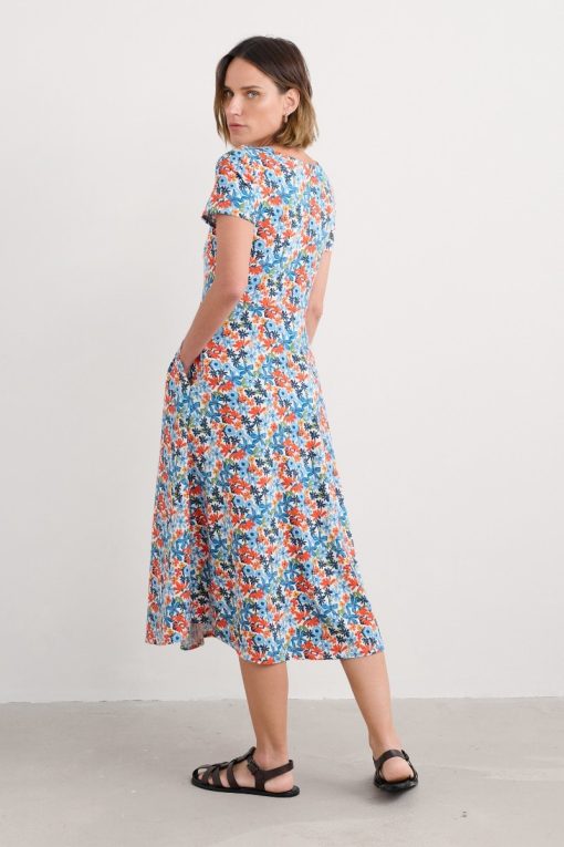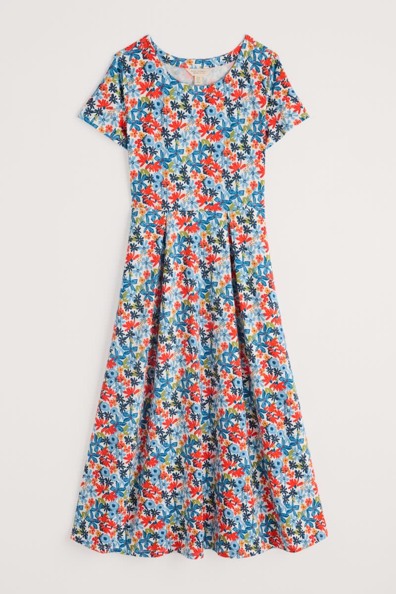 A half-sleeve version of our favourite Veronica Dress, with the same versatile midi length and drapey pleated skirt. The easy shape and organic cotton blend jersey give a lovely movement to our handcrafted prints. We’ll be wearing it with simple trainers and sandals all summer long.