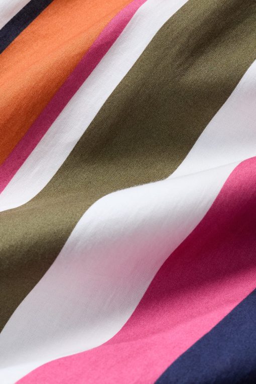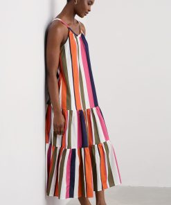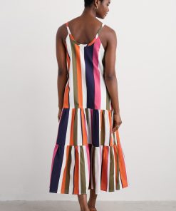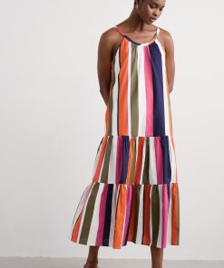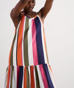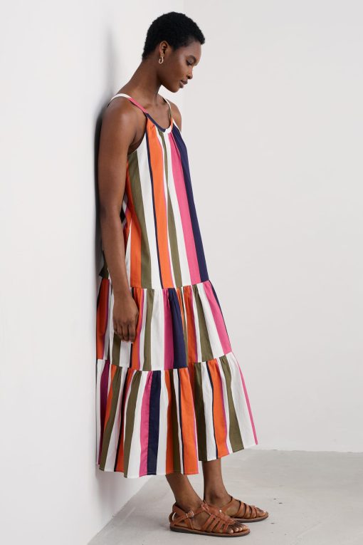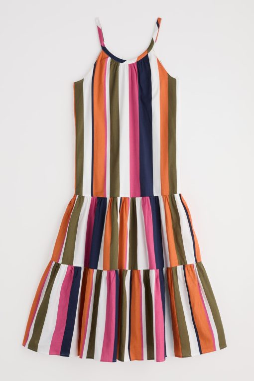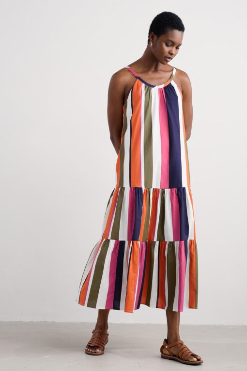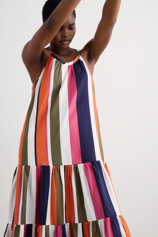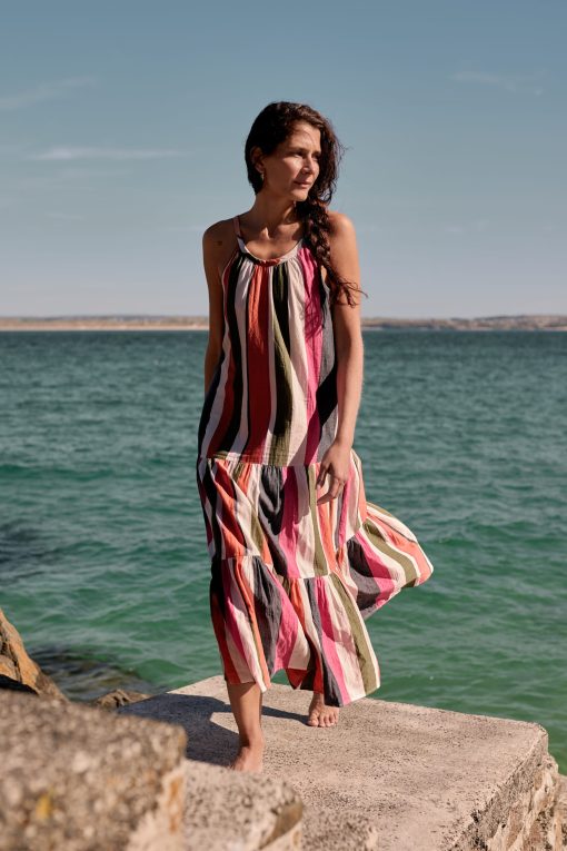 A dress that simply sings of summer, with long, swaying tiers in beautifully bold colours. The organic cotton is cool and light for sunny days, while the gathers at the neckline create a lovely drape. Its slim neck strap gives the dress a halterneck appearance at the front, while curving around to a simple scoop at the back. Light organic cotton voile lining keeps you feeling cool and comfortable. One to enjoy.