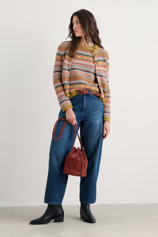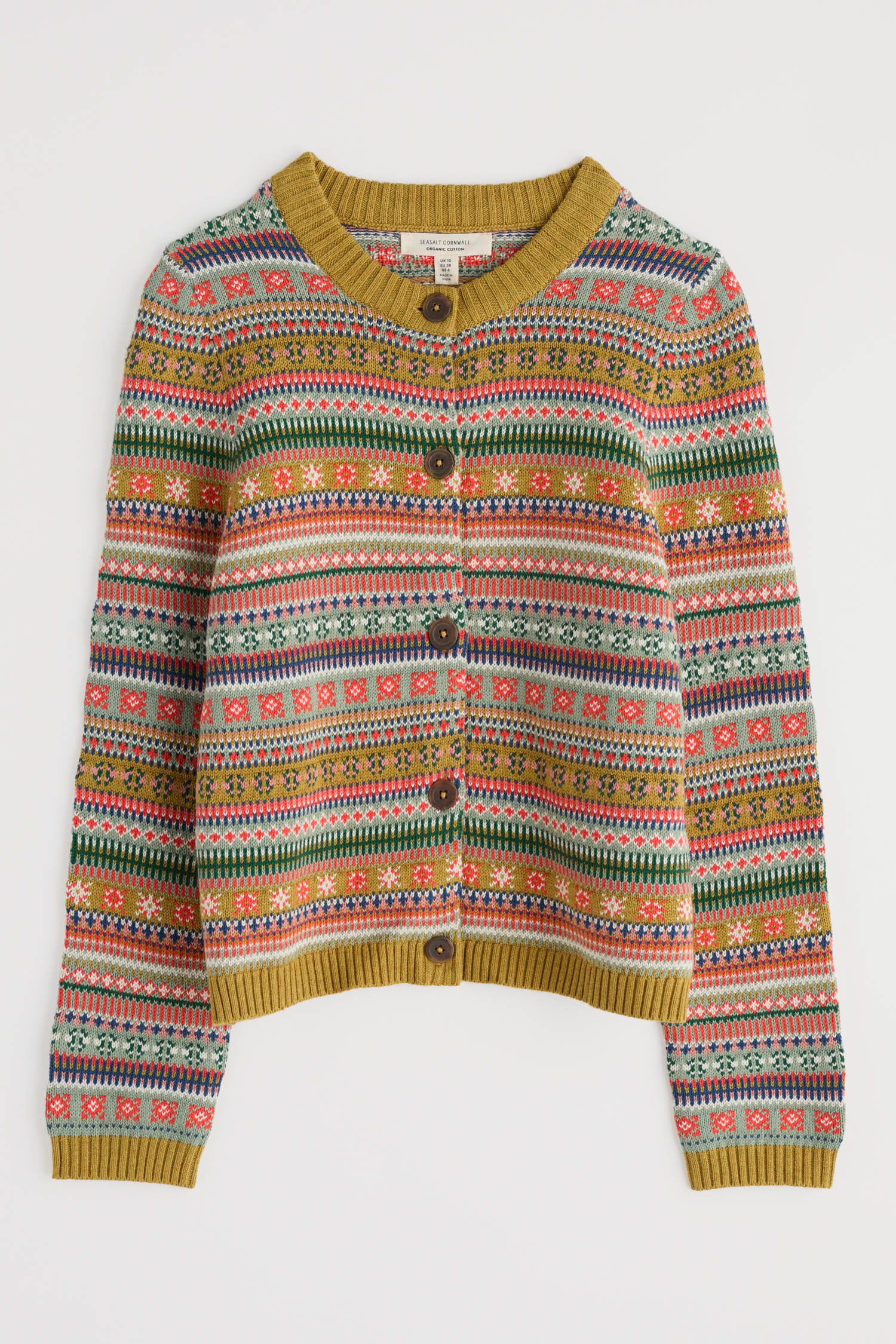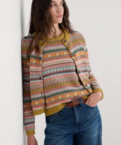 A knitted Fair Isle cardigan that’s alive with colour and intricate patterning. Ribbing at the five-button placket, cuffs and high crew neck gives the organic cotton cardigan a traditional touch. Inspired by this season’s rich palette, the Cove Cottage will pair with so many colour combinations: layer over a long dress or team with your jeans.