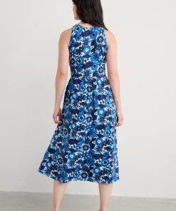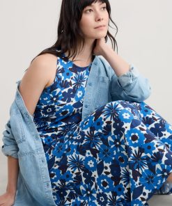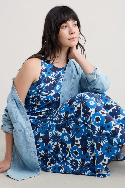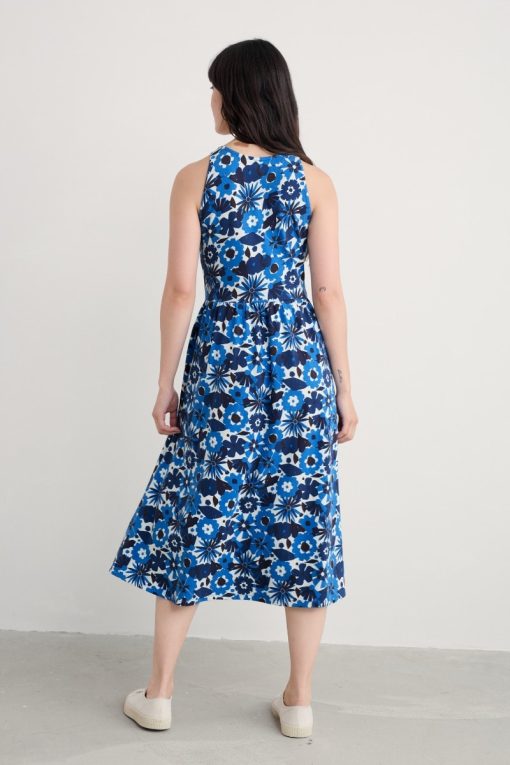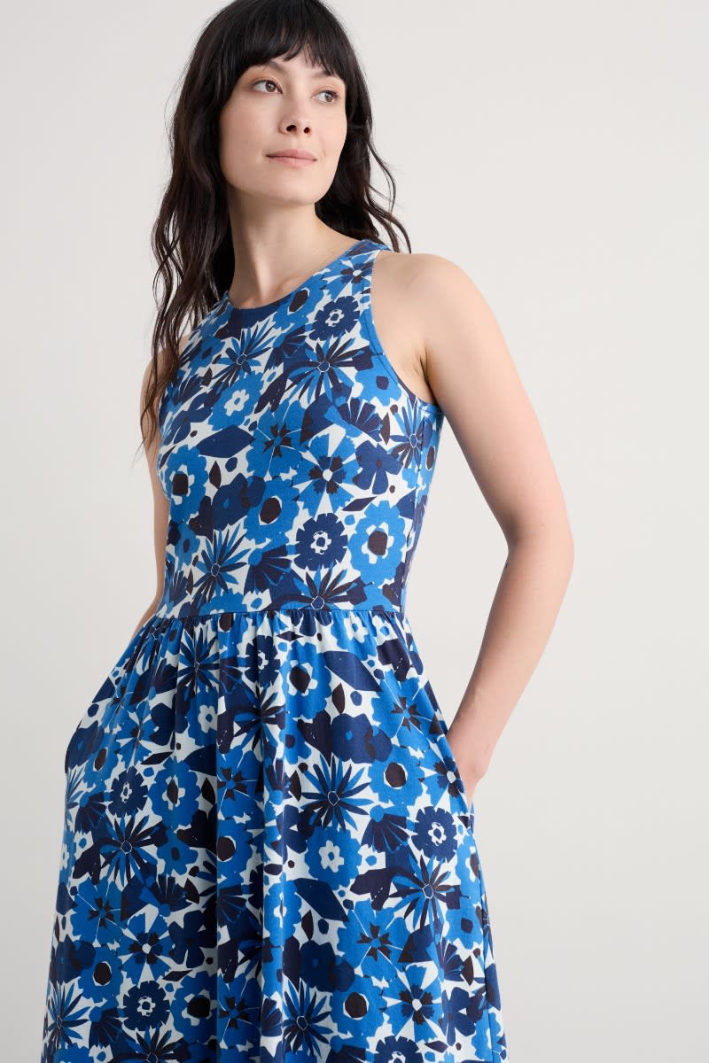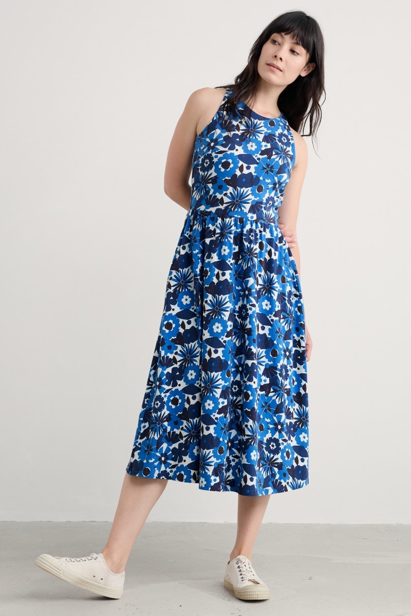 Made for easy days and featuring an original Seasalt print. The Porthmeor Wave Dress is crafted from soft GOTS-certified organic cotton jersey. It has a gently waisted cut, with the sleeveless bodice opening out into a gathered, midi-length skirt. A classic boat neckline and a pair of in-seam pockets add the finishing touches.