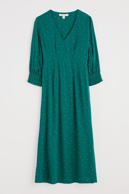 With its full, long skirt and drapey fabric, the Bell Gable Dress has a lovely sway and movement when you walk. Its empire line cut and bust darts create a flattering outline, with the deep V-neckline adding a subtly elegant touch. Pretty smocking at the cuffs gives the printed dress a summery feel.