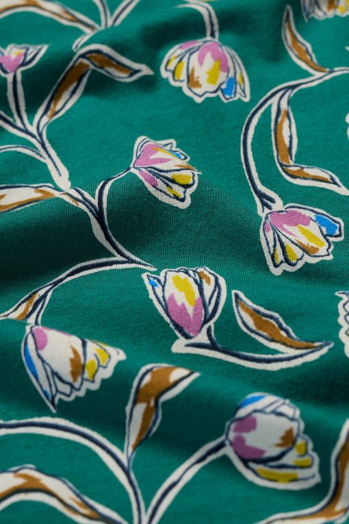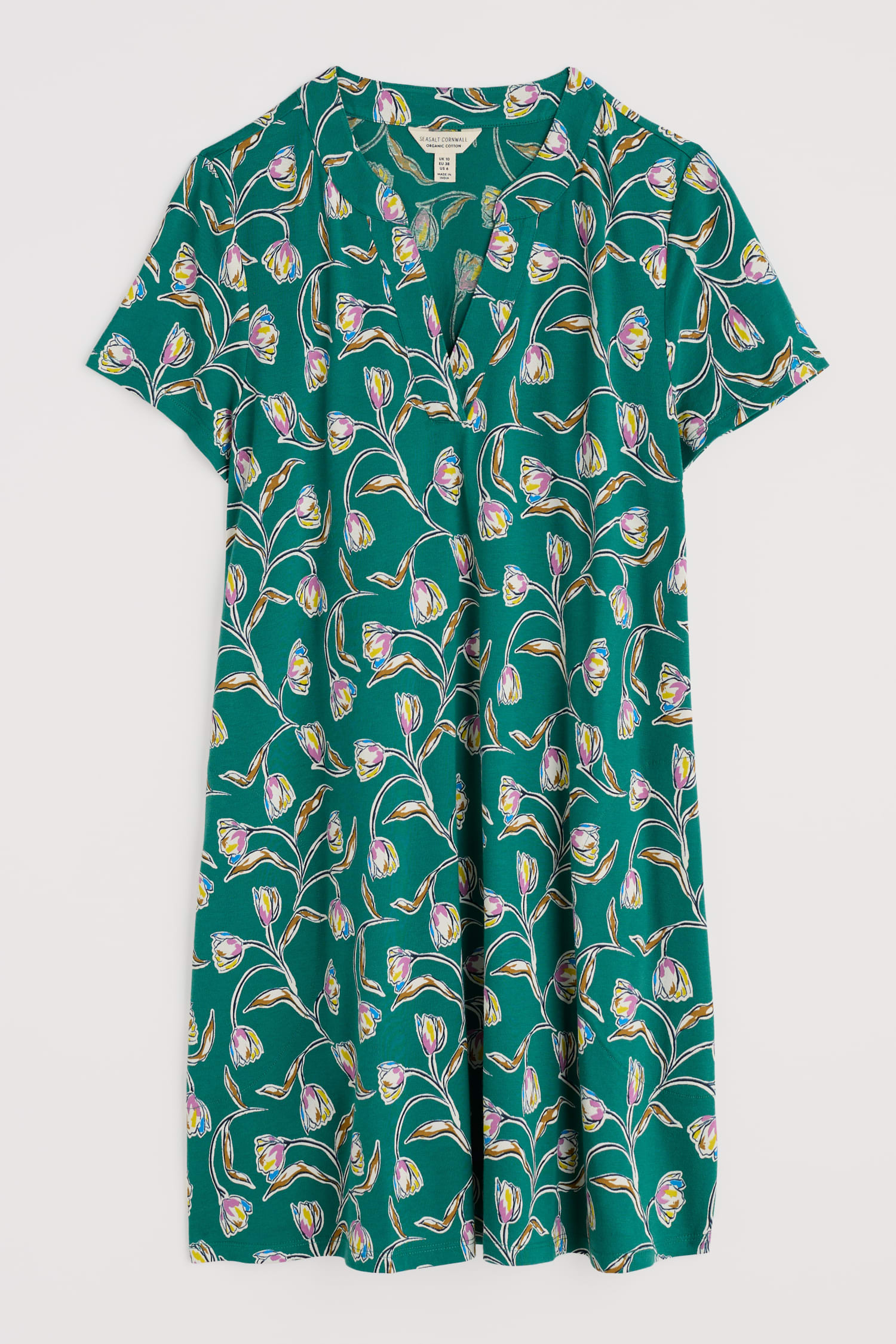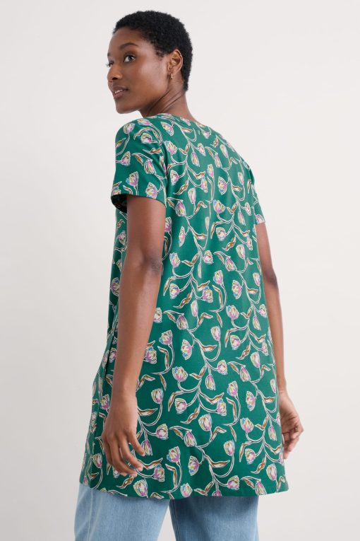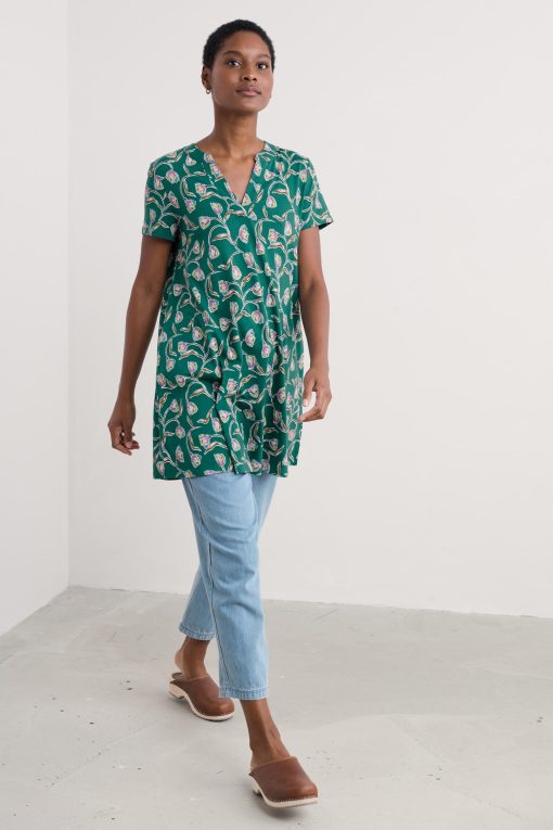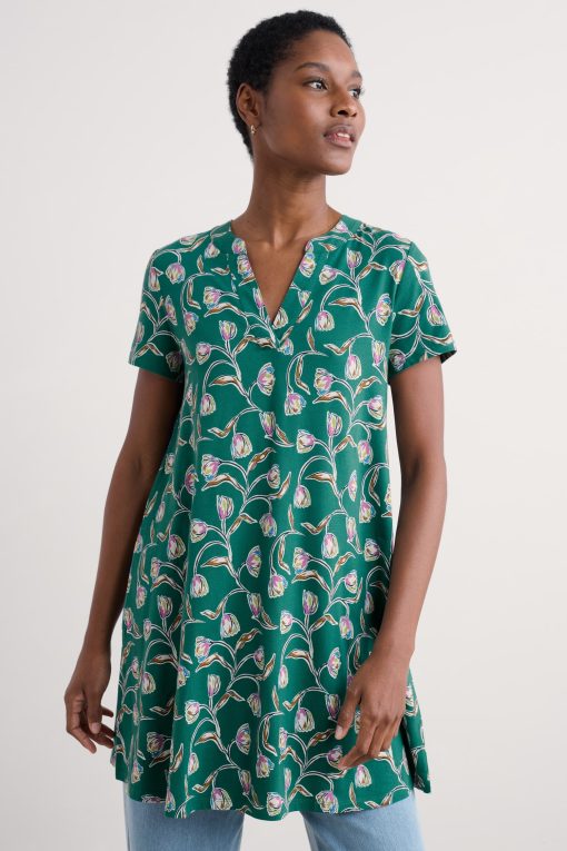 A pretty printed tunic to see you through the season. It’s made from a soft jersey blend of breathable organic cotton and stretchy elastane. The short sleeve style is ready for summer, while the A-line shape is easy-wearing for warmer days. The notch neckline and side pockets with profile stitched detailing add finishing touches.