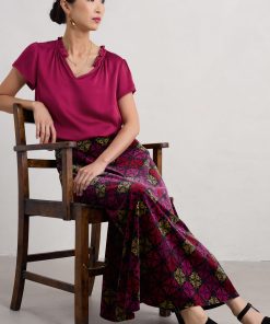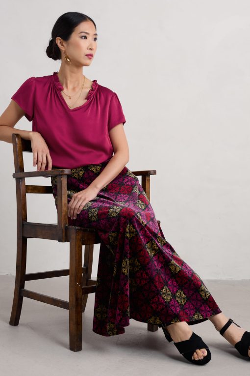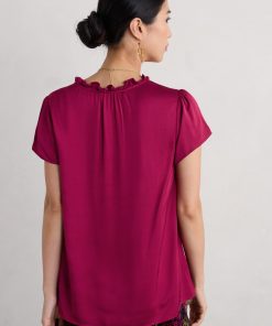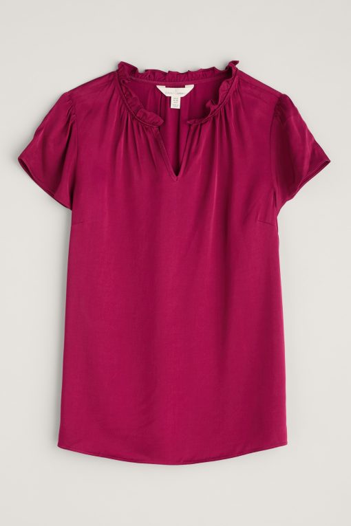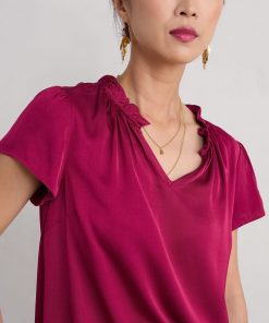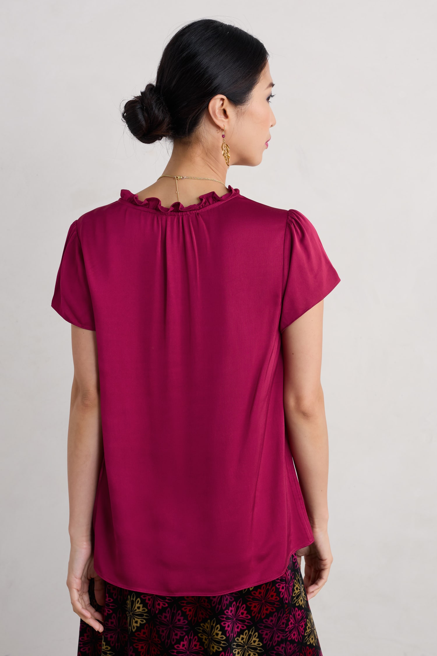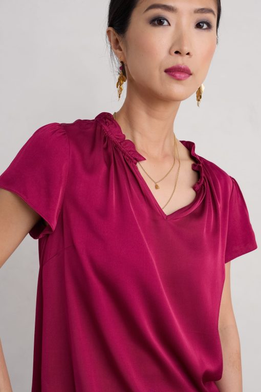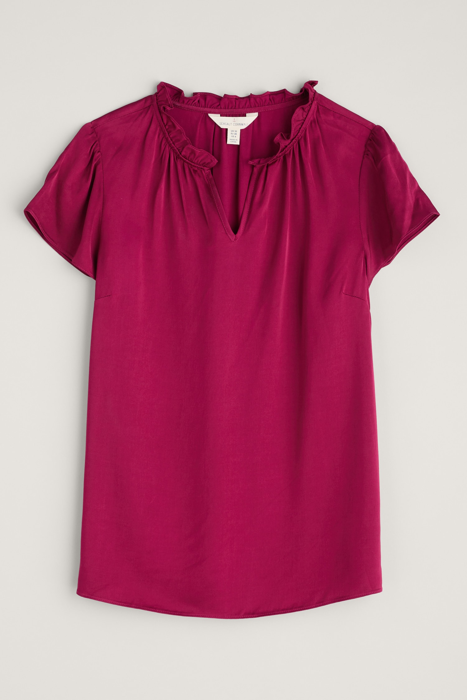 Made from a smooth and drapey satin fabric, this top has a flowing feel that’s enhanced by soft gathers. The frill at the notch neckline adds a delicate detail, complemented by the loose short sleeves.