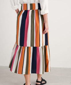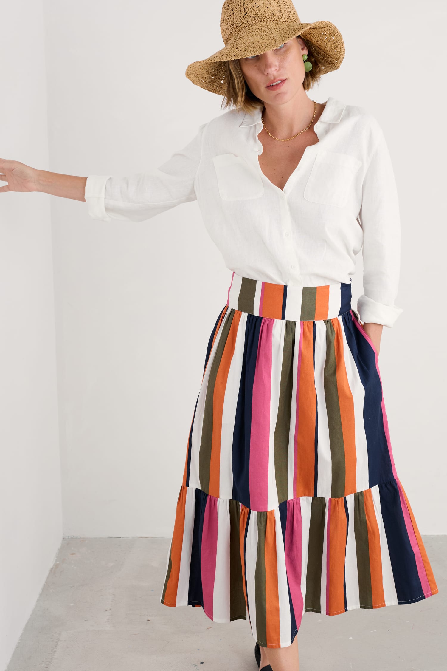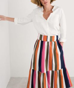 A full, swirly skirt that’s a joy to wear on a sunny day. It’s made from organic cotton, with light voile lining for cool comfort. Gathers from the waistband add volume to the skirt, which finishes in a deep-frilled hem. The cheerful striped print changes direction, emphasising the pretty, tiered shape. In-seam pockets add the perfect finishing touch.